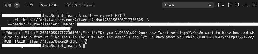VSCodeのターミナルでcURLを実行してみたところ、ちゃんとツイートが取れた。