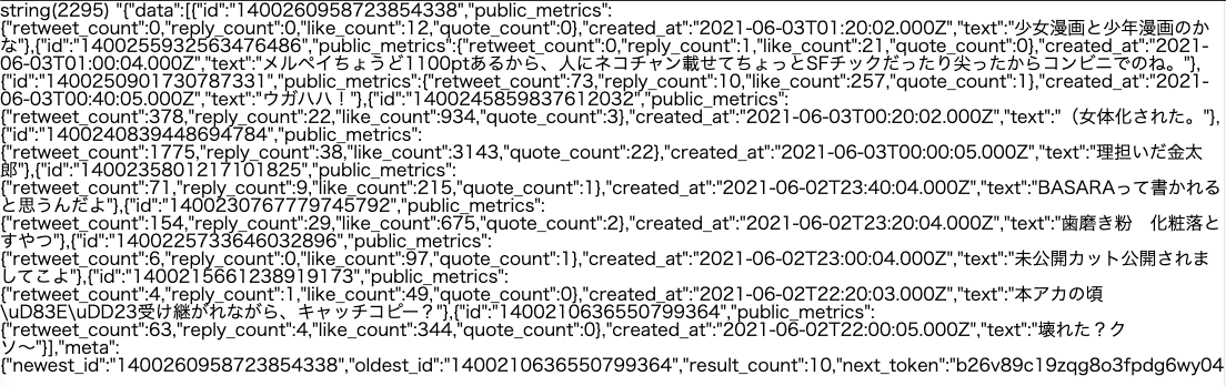 エンドポイントのURLを、「https://api.twitter.com/2/tweets/search/recent?query=from:shuumai」にすると@shuumaiのツイートデータがいくつか取れるので遊ぼう。