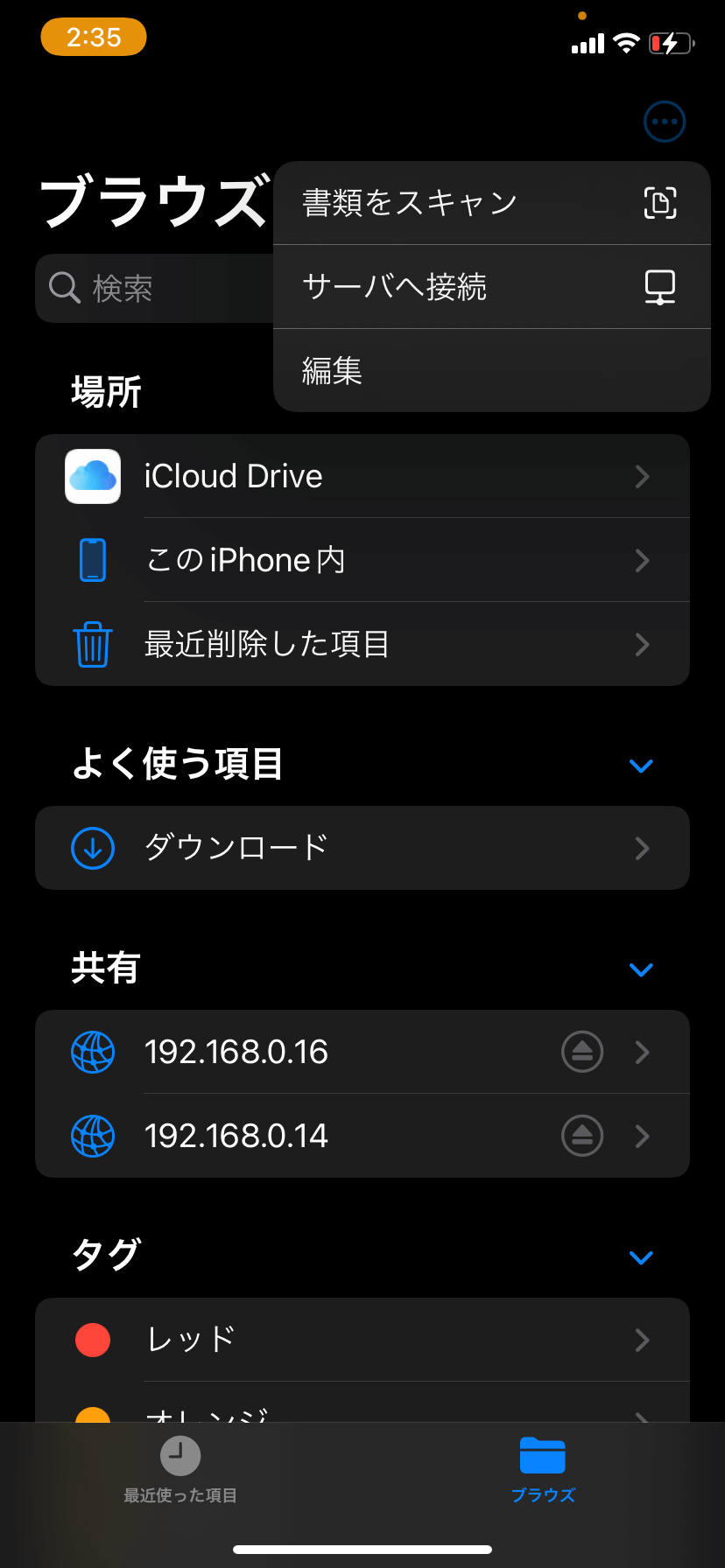 「ブラウズ」タブをタップして、右上の「…」から「サーバへ接続」を選択します。