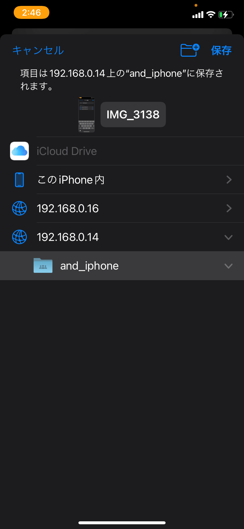 上記の設定が完了していれば地球儀マークの下層に共有したフォルダが表示されているので、選択して「保存」します。
