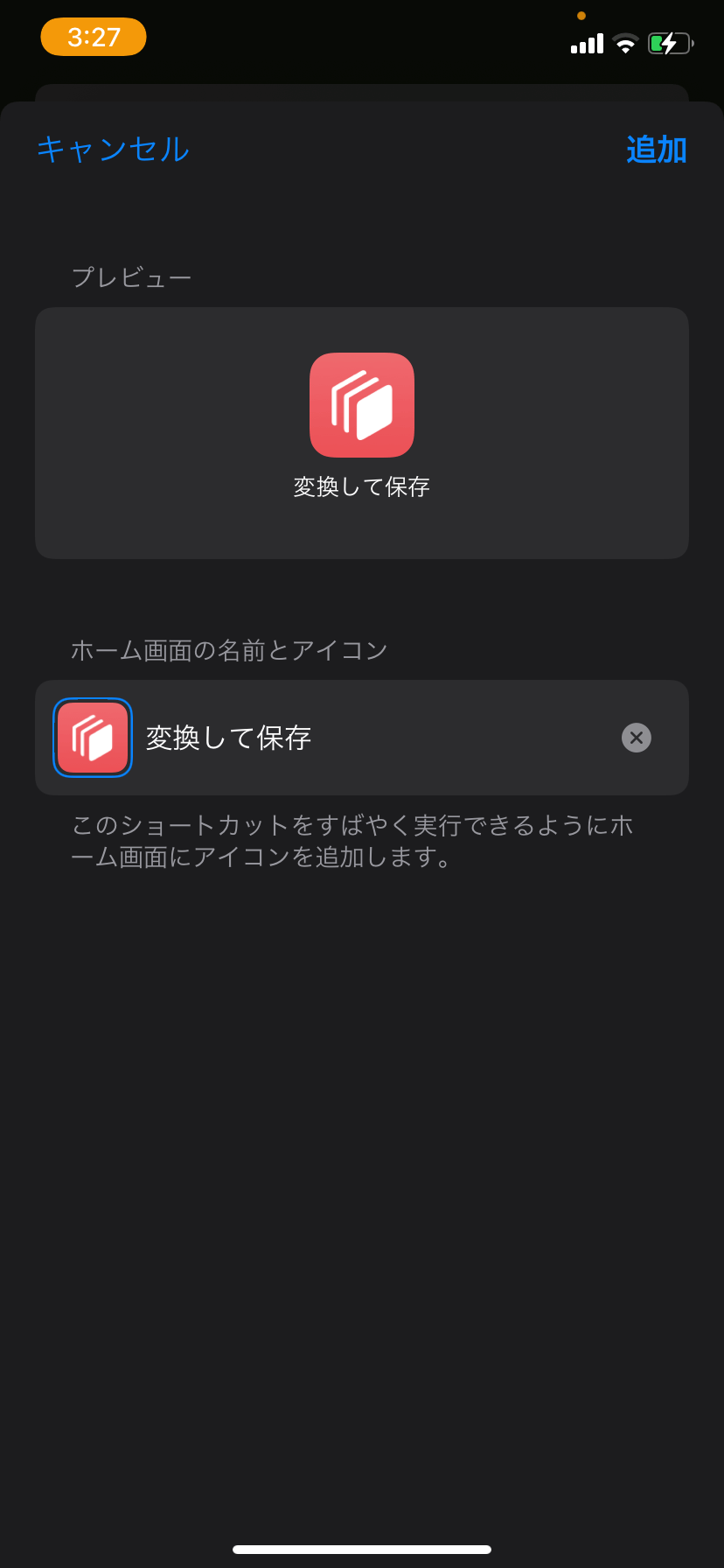 適当な名前をつけて、右下の「共有」ボタンから「ホーム画面に追加」を選択。
